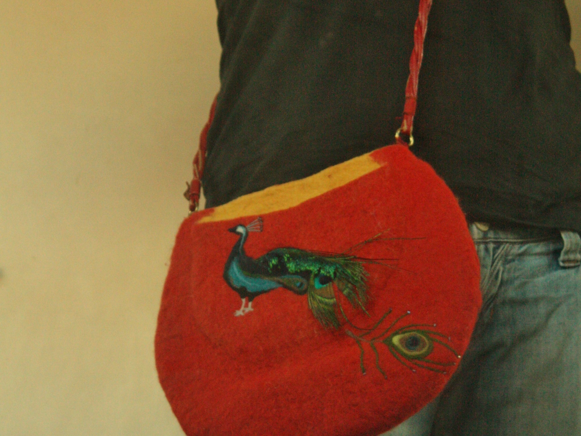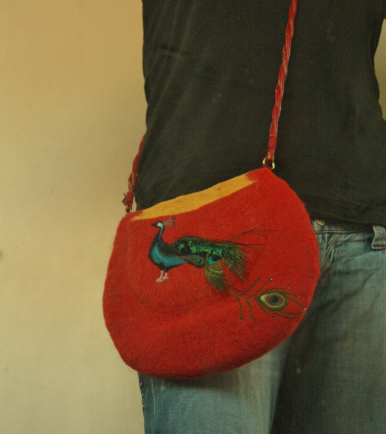 Finally I’ve got a strap for the Peacock bag I made in the summer. The strap pleasingly broke off my other bag so I’ve up-cycled it and attached it with the help of a bit of old red Sari silk. I am strutting it round the house as we speak…
